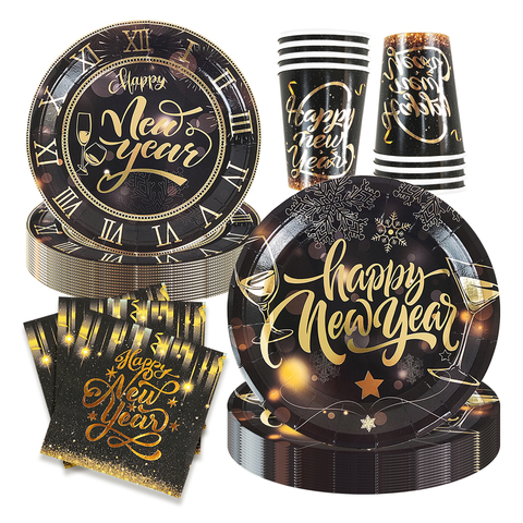 مجموعة أدوات مائدة ورقية حديثة لاحتفالات رأس السنة الجديدة 2025، ديكور ذهبي وأسود بثيم سنة جديدة سعيدة