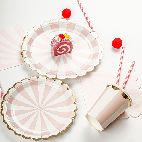 Wegwerp Servies Papieren Bord Feesttafel Decoratie Benodigdheden Roze Hete Stempelen Gestreepte Ronde Papieren Borden Groothandel