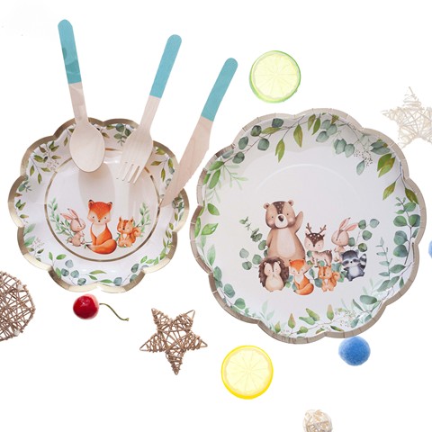 Yeni tek kullanımlık hayvan piknik parçalanabilir kağıt sofra seti güzel tilki ve ayı parti kiti